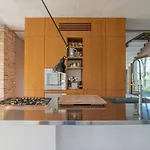 Ett delat kök är utrustat med köksutrustning, såsom mikrovågsugn, kylskåp och köksredskap.